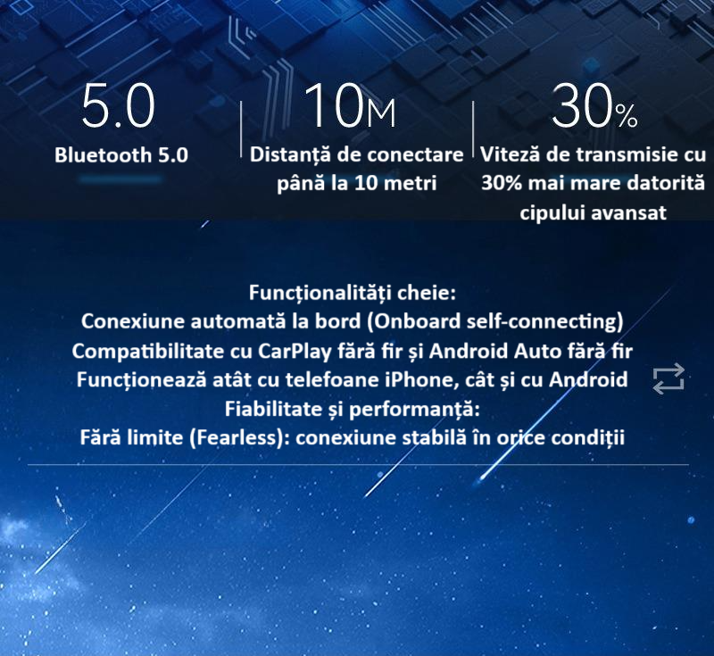 Acest adaptor iti ofera o modalitate convenabila de a trece de la CarPlay cu fir la CarPlay wireless si Android Auto, pastrand toate functiile esentiale ale sistemului tau auto. Indiferent daca navighezi, asculti muzica sau raspunzi la apeluri, ZYTEQ®️ Q1 iti face viata mai usoara, fara fire sau complicatii.