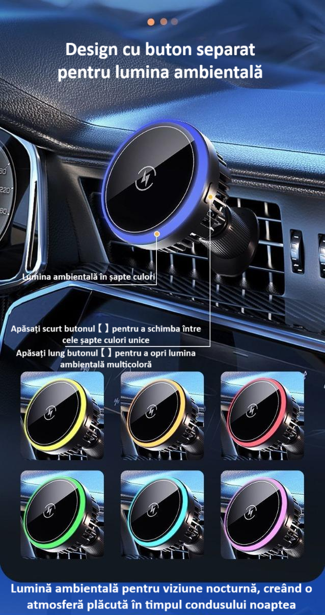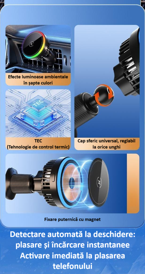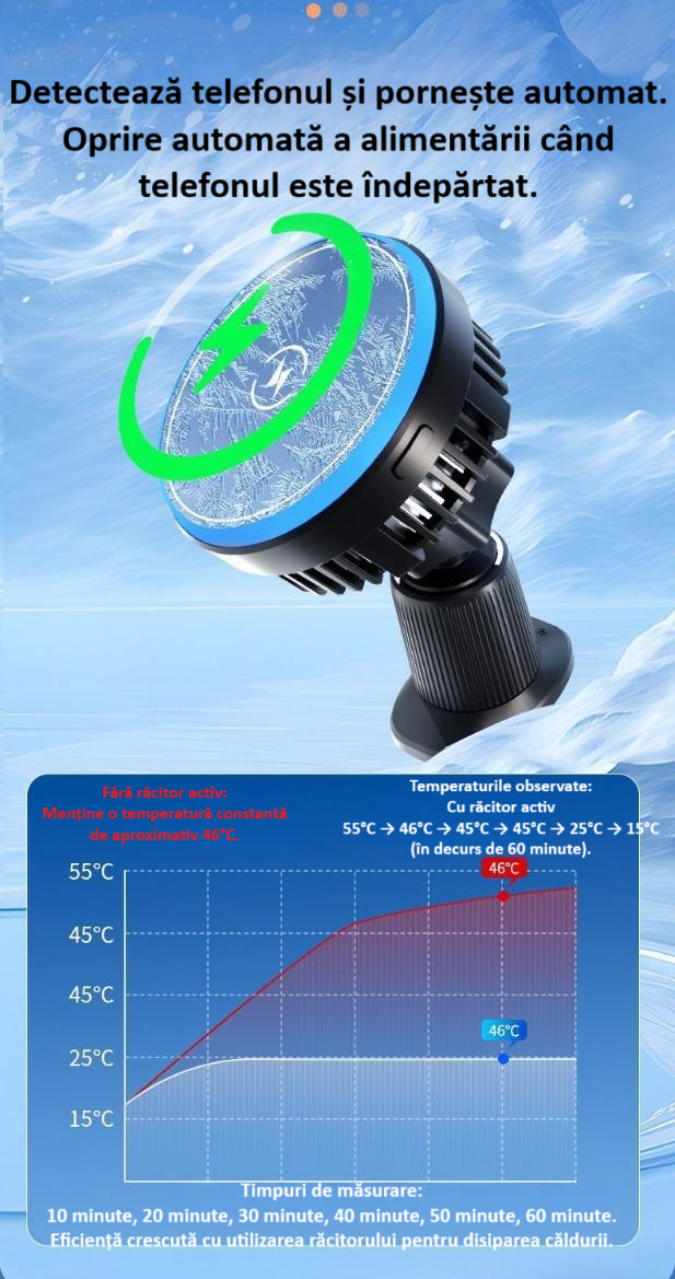 • Functie de Racire: Suportul auto este echipat cu un sistem de racire integrat, care ajuta la mentinerea temperaturii ideale a dispozitivului in timpul incarcarii, prevenind supraincalzirea.
