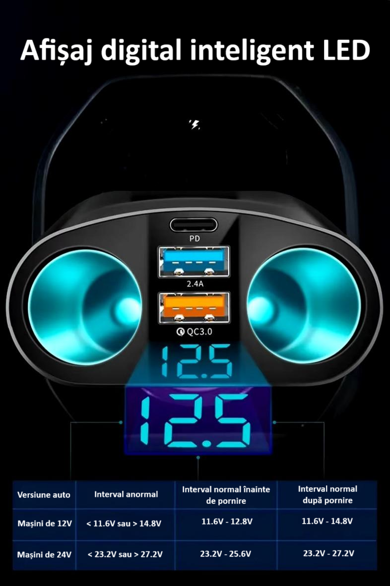 • Afisaj digital inteligent LED: Monitorizeaza usor starea de incarcare a dispozitivelor tale direct pe ecranul LED, iar afisajul indica si tensiunea bateriei auto pentru siguranta suplimentara.