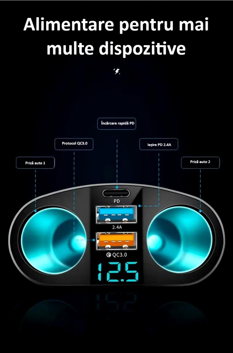 Splitter pentru Bricheta Auto ZYTEQ®️, 5 Porturi, Adaptor Priza Auto Multiplicator, cu Afisaj Digital, Incarcare Rapida QC3.0 si PD 20W, 2 Socluri Bricheta, 1 x USB-C, Afisaj Inteligent LED, Rotire 360°, Negru