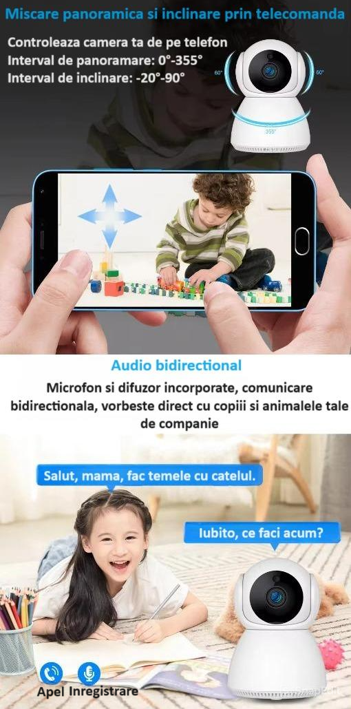 - Panoramare si Inclinare (PAN-TILT): Monitorizeaza intreaga camera cu miscari fluide de panoramare cu 355° si inclinare cu 90°.