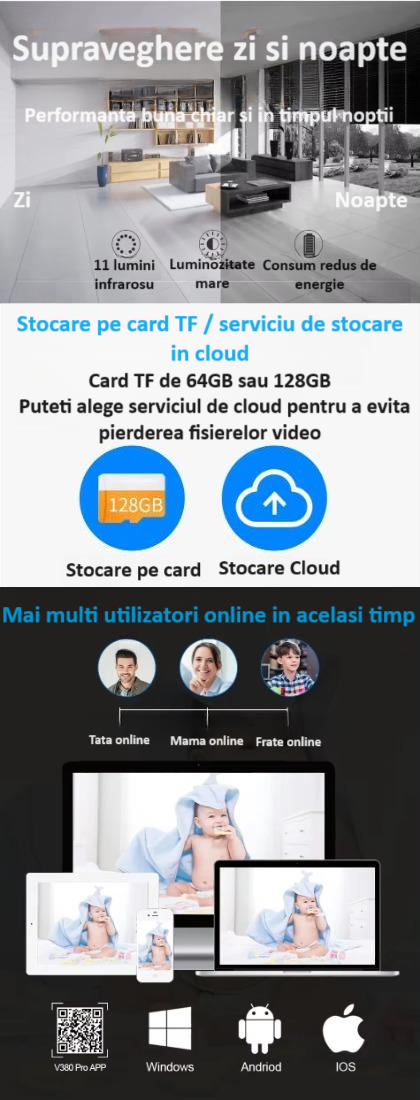 Fie ca esti acasa sau departe, camera de supraveghere V380 Pro iti ofera linistea deplina ca poti monitoriza fiecare moment important din viata micutului tau. Alege calitatea si siguranta pentru familia ta cu solutiile noastre inovative!