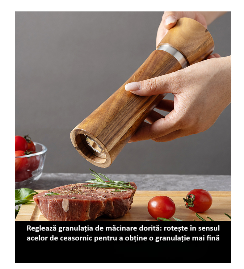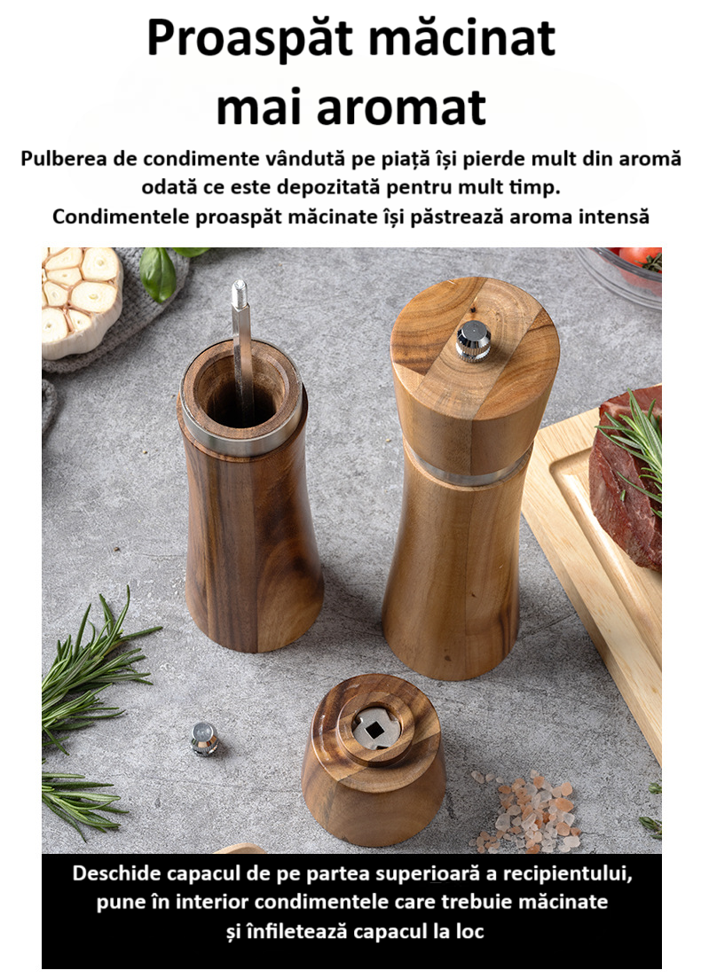 • Materiale Premium: Realizate din lemn de acacia de calitate superioara, cu un inel elegant din otel negru si finisaj maro natural, aceste rasnite adauga o nota de lux oricarei bucatarii.