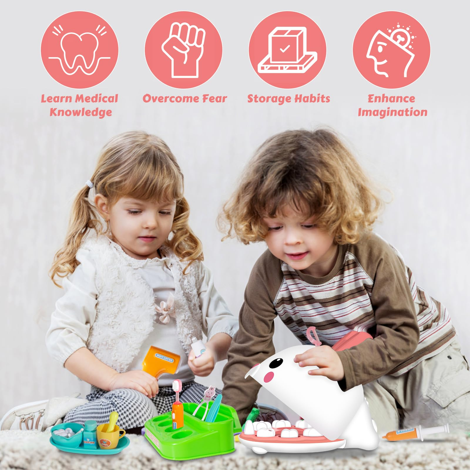 Educatie prin Joaca: Copilul invata intr-un mod distractiv despre importanta spalatului pe dinti si despre cum se desfasoara o vizita la dentist. Jucaria reduce teama de medicul stomatolog, transformand ingrijirea dentara intr-o activitate familiara si placuta.