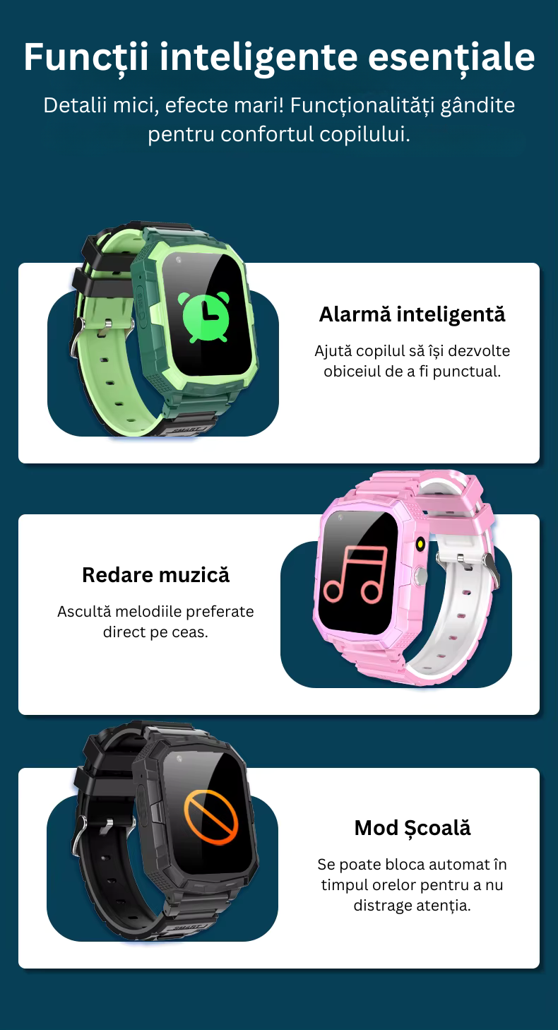 Un pic de distracție? Desigur! Ceasul vine cu jocuri logice și educative, care dezvoltă gândirea și coordonarea, fără a distrage copilul prea mult. Exact cât trebuie pentru o pauză simpatică!