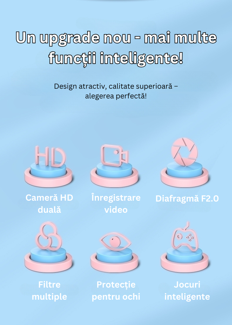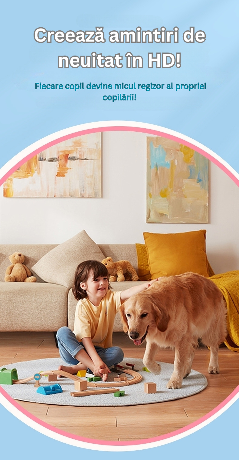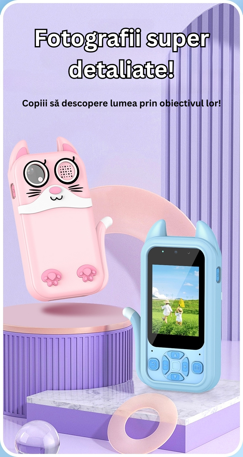 Copiii pot face poze clare si videoclipuri pentru a-si documenta aventurile zilnice. De asemenea, camera ofera filtre foto amuzante, facand experienta si mai distractiva.