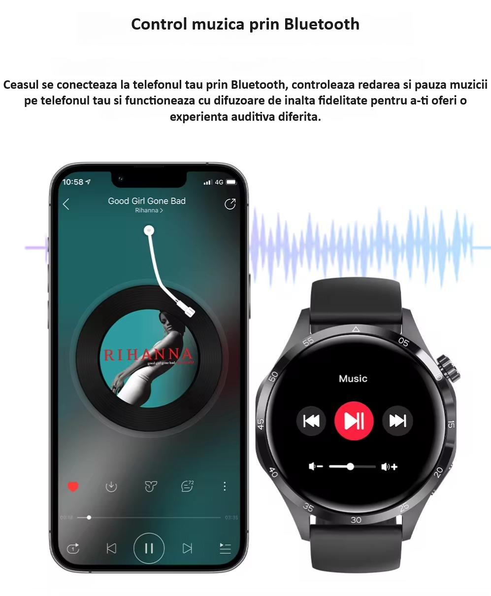 • Asistent Vocal AI si Apeluri BT: Controleaza ceasul cu vocea ta si raspunde la apeluri direct de pe incheietura mainii.